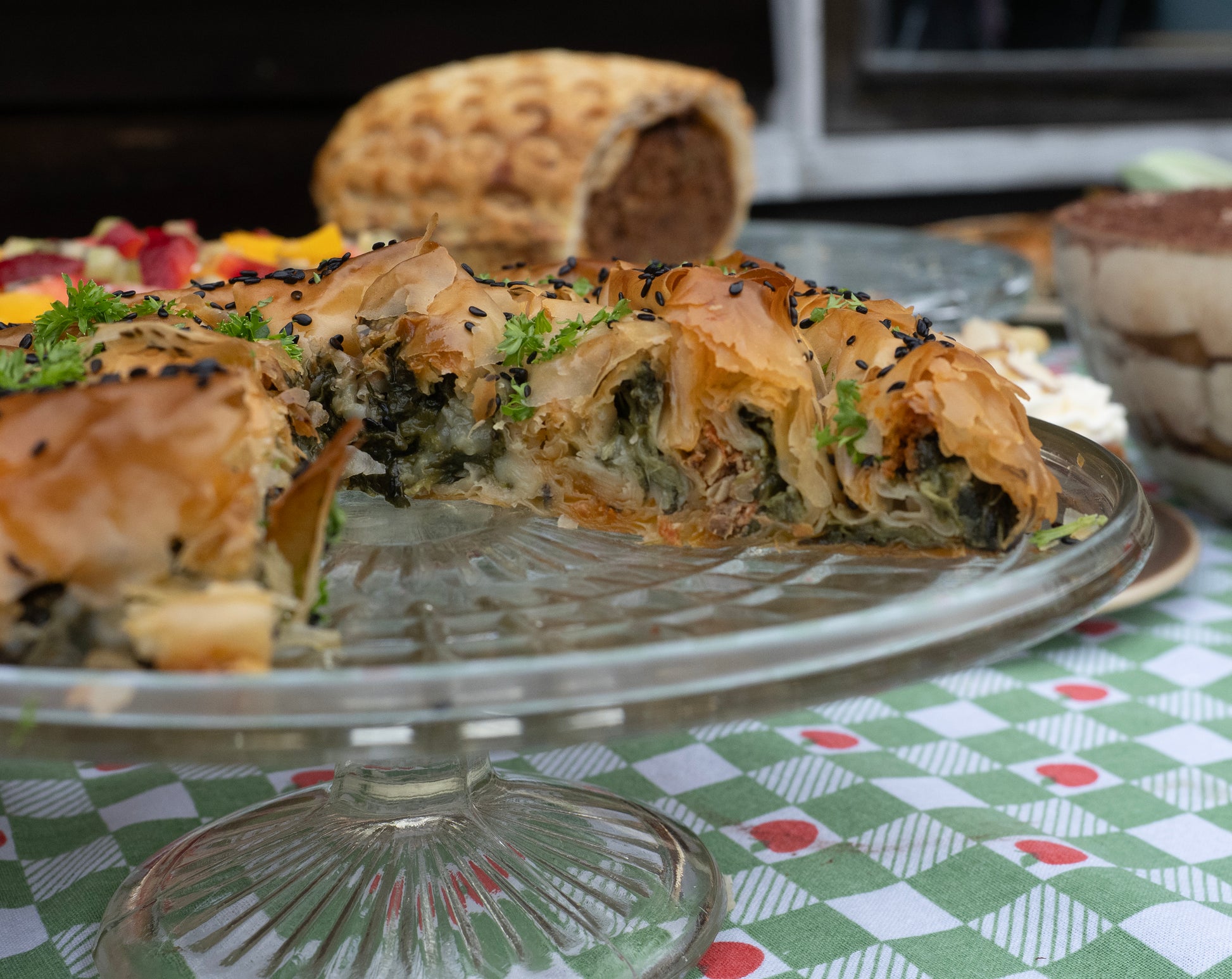 A crispy filo spiral, filled with a tasty mix of spinach, olives, cheese and sundried tomatoes.
